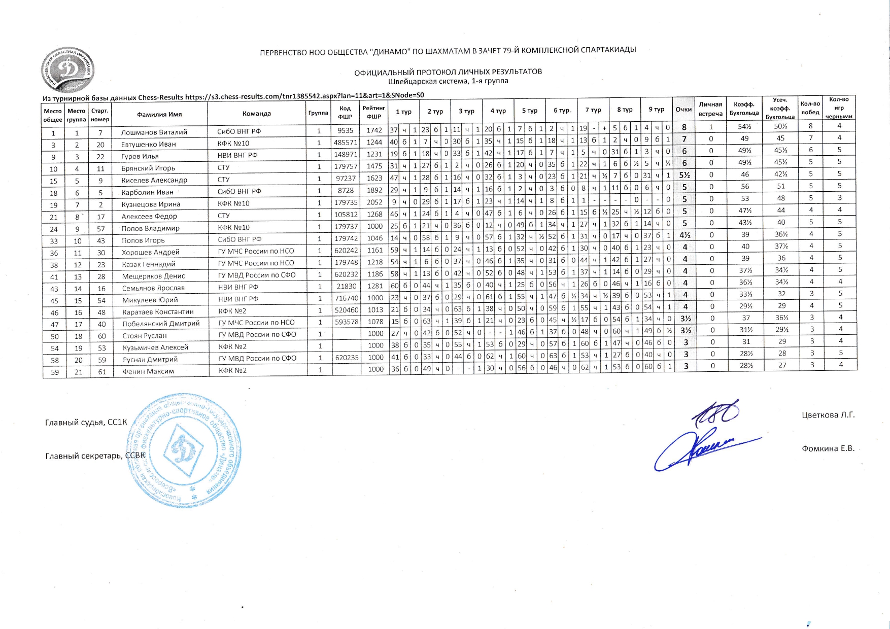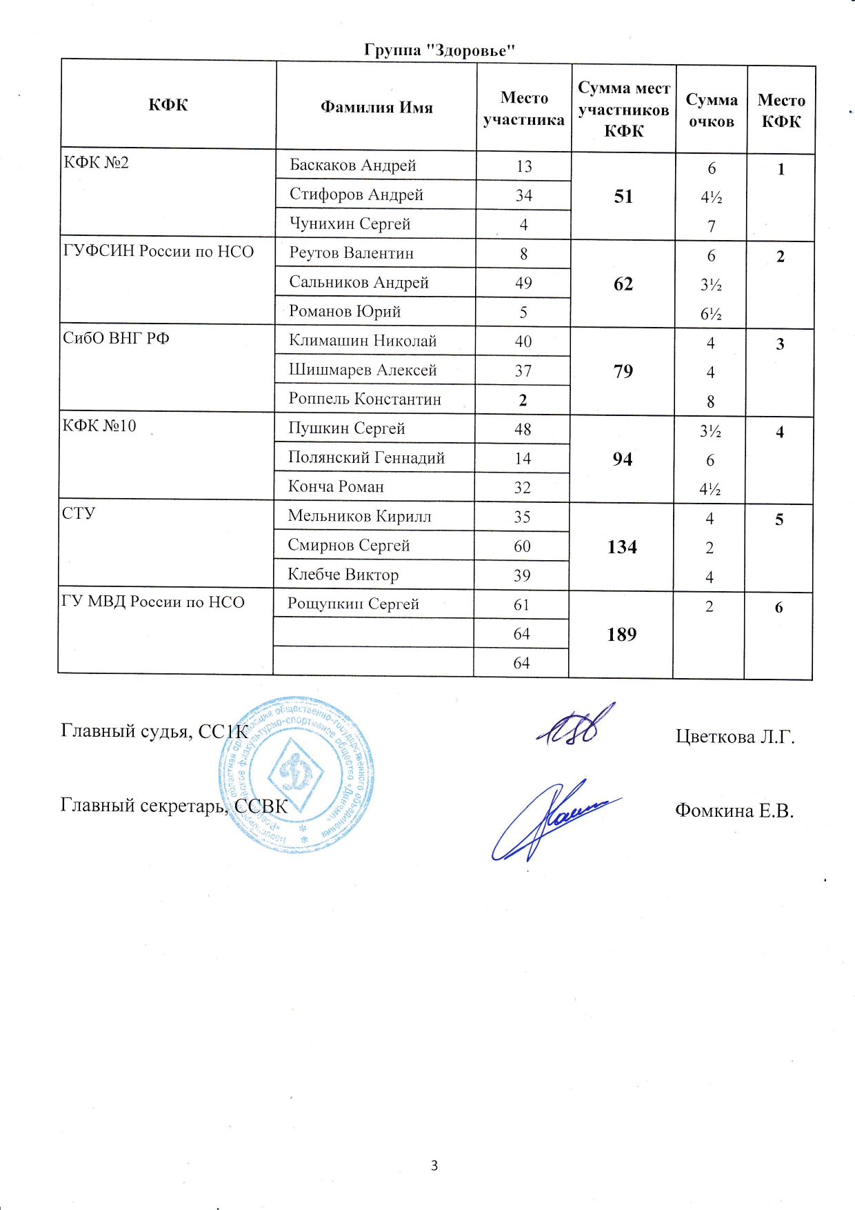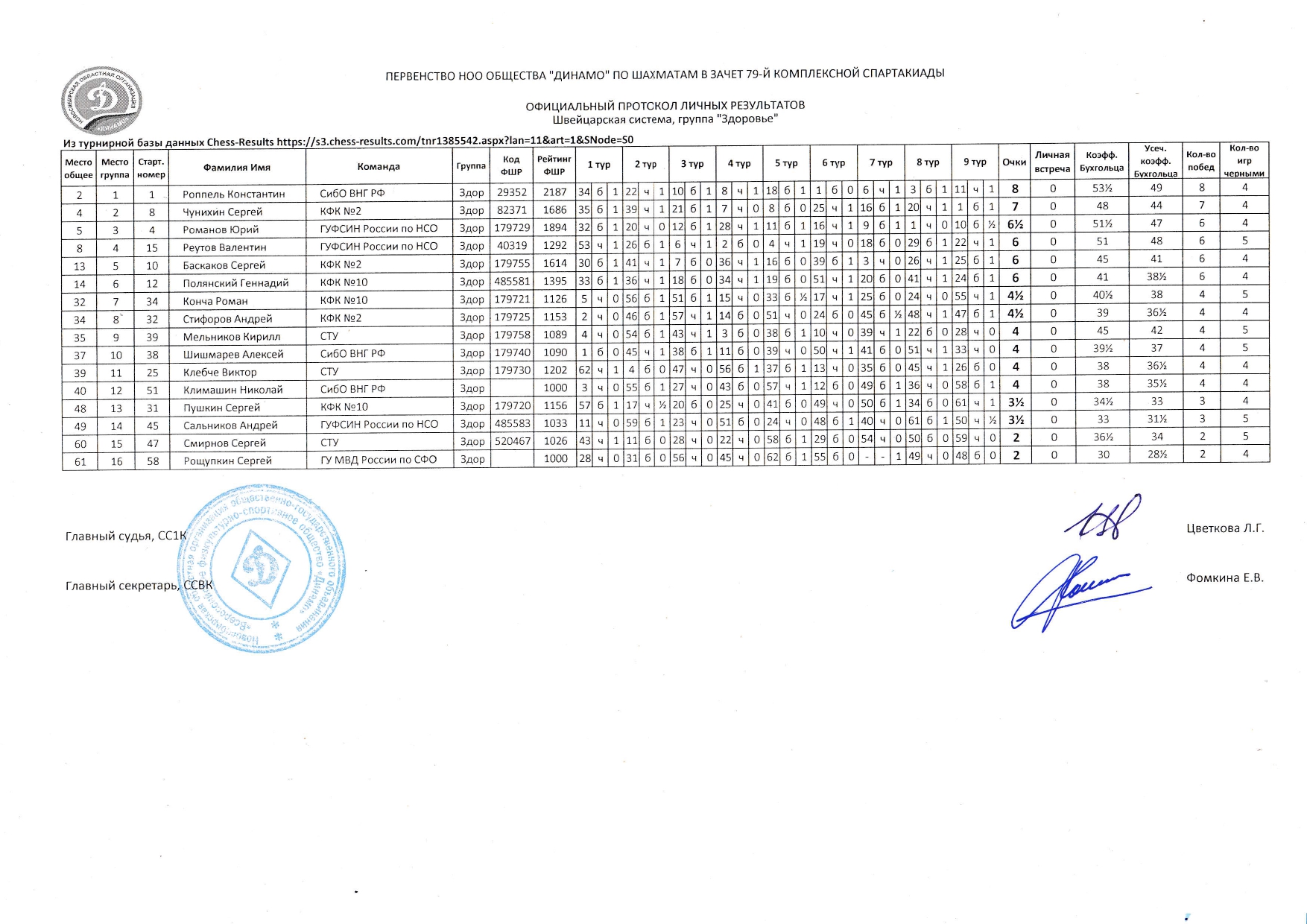 Итоги соревнований по шахматам в зачет 79-й комплексной Спартакиады среди КФК 1, 2, 3 групп, группы "Здоровье"