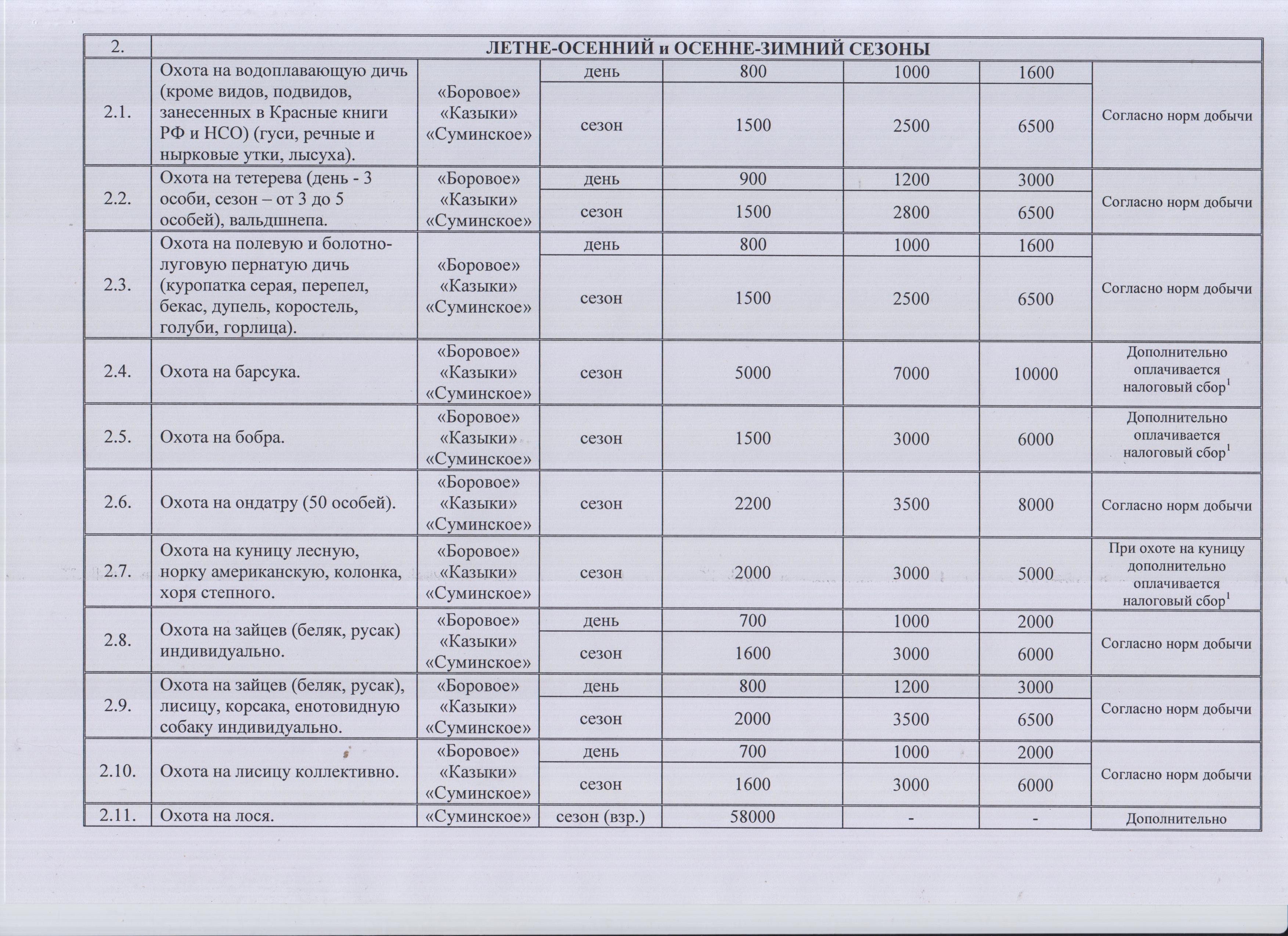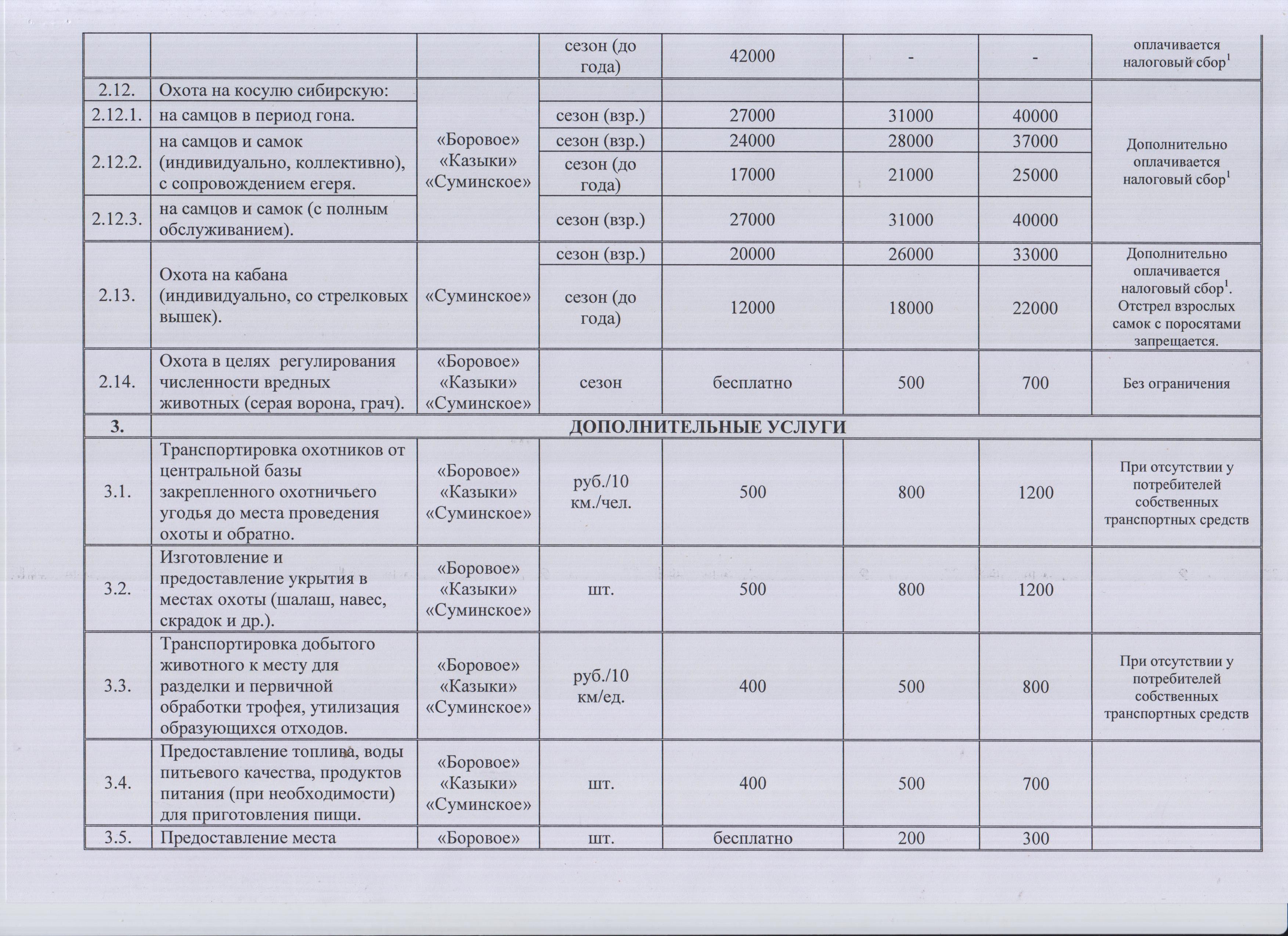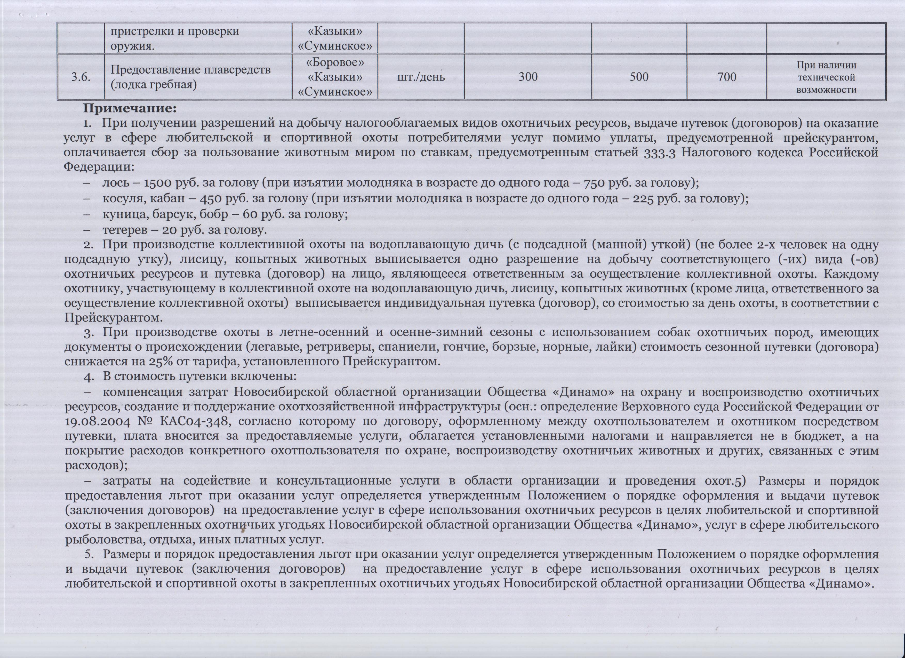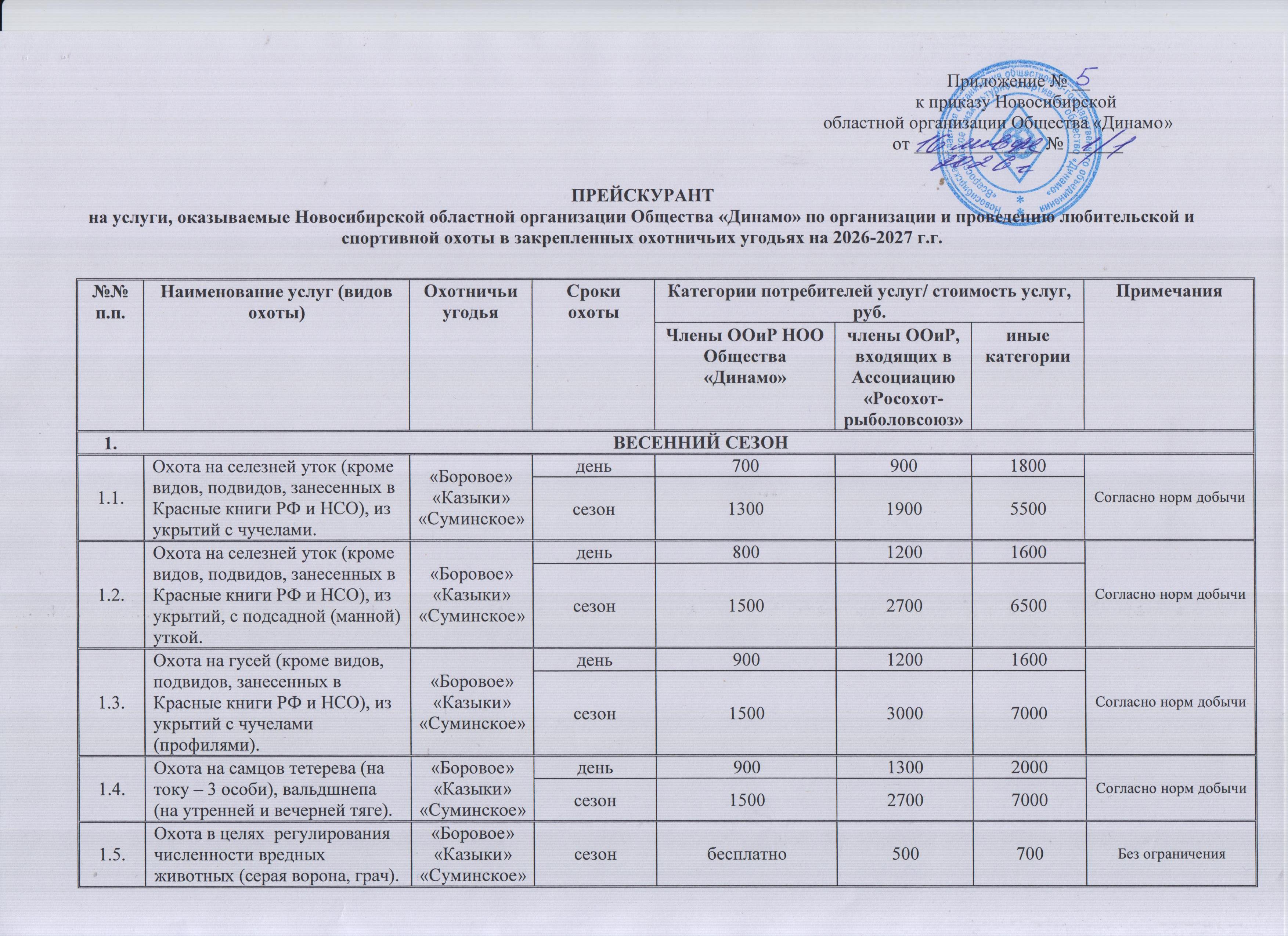 Прейскурант на услуги, оказываемые Новосибирской областной организацией Общества "Динамо" по организации и проведению любительской и спортивной охоты в закрепленных охотничьих угодьях на 2026-2027 гг.