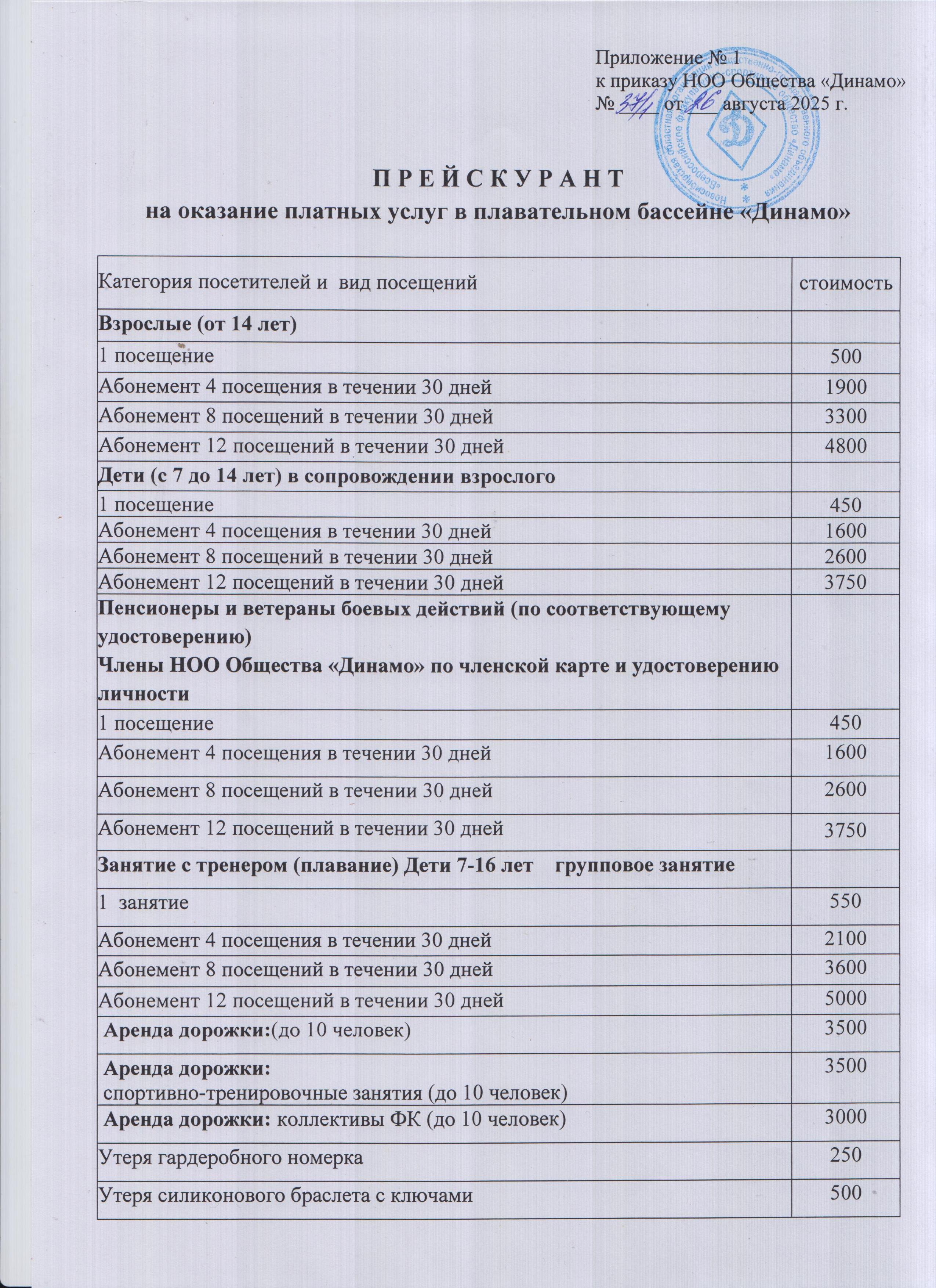 Прейскурант на услуги плавательного бассейна НОО Общества "Динамо"